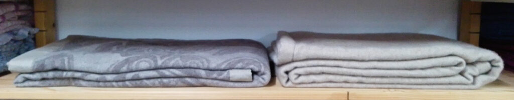 現在ではポリエステル糸を使ったものも出回っています。ヨーロッパでも経糸にウールを使ったカシミヤ毛布がありますが、その場合はカシミヤ80%ウール20%の様に表示されていますので、決してカシミヤ100%表示になりません。