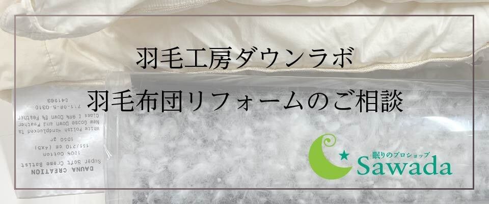 眠りのプロショップSawadaの羽毛工房ダウンラボでは、製造からリフォームの全工程を一括で行っています。ドイツLorch社の羽毛リフレッシュマシンを店頭に備えているのは日本で2社のみです。リフォームだけで3000枚以上の実績があるため、羽毛のノウハウが多いのです。
