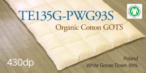 このTE135G生地に、マザーグースに近いパワーとホコリが少ないポーランド産のホワイトグース ダウン率93%を組み合わせました。オールシーズン使うために、中厚掛850gと肌掛300gを用意します。